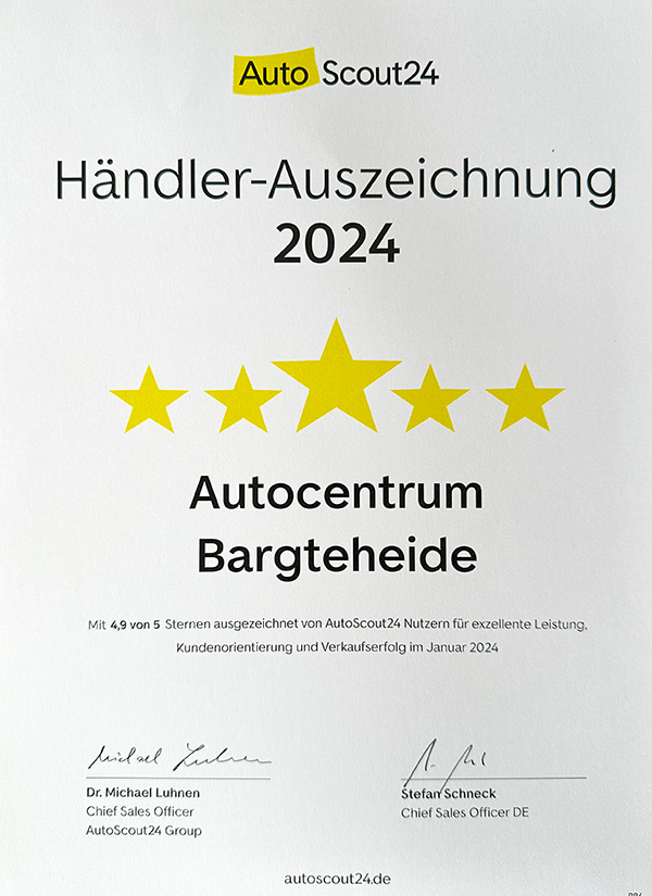 *Ausgezeichnet von „AutoScout24“ für: Service, Kompetenz, Gesamteindruck, Erreichbarkeit, Zuverlässigkeit, Angebotsbeschreibung und Kauferlebnis.